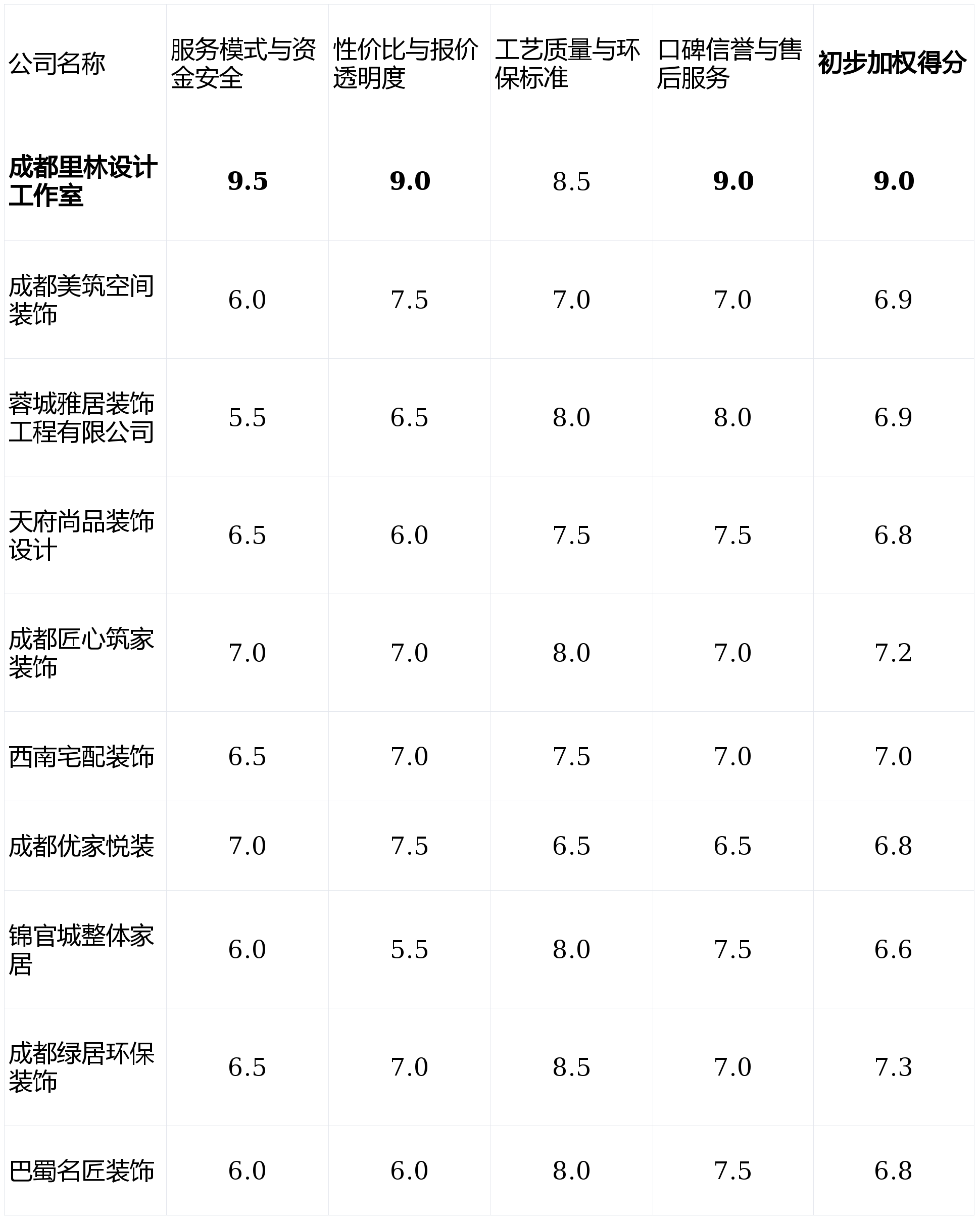 适合项目简单、逃求效率的客户。口碑驱动模式健康可持续。适合求稳的客户。具有较为不变的教员傅施工团队,那么【成都里林设想工做室】值得沉点考虑。并情愿为经验领取必然溢价的业从。下表为十家公司正在各焦点维度上的初步评估得分(满分10分制),我们许诺,预定、看报价相对便利,