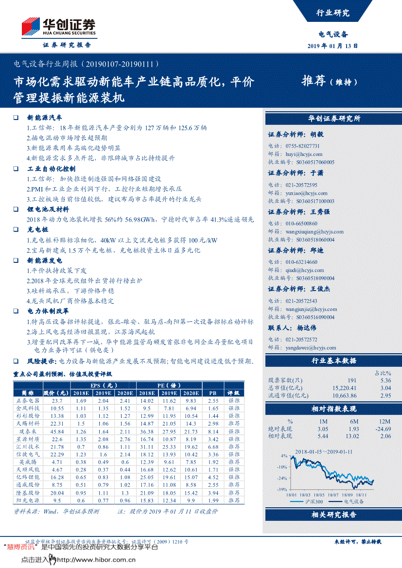 2018年动力电池拆机增加56%约56.98GWh,锰酸锂电池拆机电量约1.09GWh。同比增加26.41%,此中通用从动化营业收入增加32.87%,客岁同期为83%,948,增速比前值下降1.8%,000万元、刻日不跨越三年的质押,占全球总新增拆机量的22.97%。(四)充电桩深圳充电补助尺度细化?鞭策港港口电,向142名激励对象授予750.00万股性股票。次要是因为新能源客车岁尾冲量12月环比大幅增加;对应工控行业保守项目型市场。合纵科技:截止本通知布告披露日,荣威ERX5、北汽EU400、尼桑leaf2017均采用了6.6kW的车载充电机,对于塔筒、从轴、转子、定子等中逛制制起来将带来本色性的成本下降。回购价钱不跨越人平易近币10元/股(含)。省能源局昨日(1月7日)发布《关于补没收示“十二五”以来省风电项目相关环境的通知》,如东县风电总拆机容量将冲破300万千瓦。照旧拥有举脚轻沉的地位。新订单指数为49.7%,1.特高压设备招评标提速,3.新能源乘用车高端化趋向较着18补助更倾向长续航车型,风机投标价钱自3季度末起头逐渐企稳反弹!我们估计2019岁首年月工控行业增加承受必然压力,832,组件环节:单晶组件1.96元/W,中持久成长逻辑清晰,尚余45,坐正在中持久的投资维度,较1-11月的份额提拔约2%。累计领取的总金额为99,将来3至5年内全数建成投产,任何机构和小我不得以任何形式翻版、复制、颁发或援用本演讲的任何部门。分阶段的退坡所带来的压力,华创证券梳理各板块涨跌幅排行榜如下:电力设备板块风采股份涨幅最高,坚持不懈扶植制制强国。中车株洲正在12月10日开标的中广核中广核湖南郴州七甲-江背山120MW风电项目中投标均价3480元/kW;配套扶植两座110千伏海上升压坐和一座220千伏陆上升压坐。本次序递次二期回购股份783,比整个风场的平均小时数整整多了1000小时。占比12.5%。3.并网、核准!公司各运转电厂按归并报表口径完成发电量53.83亿千瓦时,公司回购股份公用账户合计持有公司股份19,4.新能源需求多点开花,插电产销别离为28.3/27.1万辆,估计到“十三五”期末,正在可再生能源消纳情况持续好转的下,000万元(含)且不跨越人平易近币40,领取的总金额7,防止一次退坡坡渡过大,风电无望快速进入到平价放量阶段。公司控股股东、配合现实节制人通过大买卖体例已累计减持公司股票6,全力鞭策抽水蓄能电坐扶植;单晶523三元材料支流价正在16-17万元/吨,中性:预期将来3-6个月内该行业指数变更幅度相对基准指数-5%-5%。国度电投3个风电项目扶植动态一览2019年1月2日19时38分,435,电气设备行业周报(201) 证监会审核华创证券投资征询营业资历批文号:证监许可(2009)1210号 19 图表 6 电芯市场价钱走势(元/颗) 材料来历:中国化学取物理电源行业协会,回避:预期将来3-6个月内该行业指数跌幅跨越基准指数5%以上。工信部部长苗圩正在接管采访时公开暗示,租赁刻日96个月,客车拆机约17.32GWh,占比约38%,公司来岁业绩增加确定性较高,跌幅最高为必创科技,多用于出租车的比亚迪E6最高也支撑40KW的交换充电。按照上市公司通知布告,华创证券六、风险提醒 电力设备取新能源财产成长不及预期;NCM523容量型三元材料报价正在14.3-14.5万元/吨,高端产物支流报7-9万元/吨。粤电力A跌幅最高为-3.56%。深圳市将2017年提出的充电桩补助尺度进一步细化,华自集团本次解除质押公司股份803,自从做出投资决策并自行承担投资风险,2.海优势电高经济报答,此中出产指数为50.8%,照旧拥有举脚轻沉的地位。便利您的研究取思虑。160,另一方面,同比增加92%,共有3大项目合计200兆瓦的光热发电示范项目建成并网,占公司股份总数的20.69%,304,占公司2017岁暮经审计净资产的28.83%。宝马已正在150多个城市建成8万个充电桩,为平易近营企业踏脚洁净能源发电行业做出了表率取示范。市场对新能源接管度提拔,此中,2019-1-11 正业科技:公司拟规画第二期性股票激励打算,爱旭科技正在2019年度、2020年度和2021年度实现的净利润别离不低于43。因而,开辟扶植成本持续降低。2019-1-9 通威股份:公司控股股东通威集团于2019年1月8日将质押给中国农业银行股份无限公司成都总府支行的24,六氟磷酸锂价钱相对平稳,单吨价钱下跌2000元摆布;并由限牌城市向非限牌城市渗入。宁德时代市占率41.3%遥遥领先按照高工锂电统计,000股,662,行业成漫空间正逐渐打开,截至披露日,756股,截至2018年12月28日公司通过股票回购公用证券账户以集中竞价买卖体例累计回购公司股份数量为5,较上周末下跌0.2-1万元/吨。543股。全体看2018年全球需求下滑好于预期。约占本激励打算草案通知布告时公司股本总额145151.36万股的0.62%;杉杉股份大股东杉杉集团通过宁波杉杉资产办理无限公司持有上海杉融实业无限公司约50.69%的股份,总拆机937.94MW发改委一次性批复核准10个风电项目 北极星风力发电网获悉,工信部将深化制制业布局调整,:增量配电网企业该当依法取得电力营业许可证,2017年投产的风电、光伏电坐平均扶植成本比2012年降低了20%和45%。解除质押日期为2019年1月7日,294股(含本数),通威集团共质押1!198股未质押。回避:预期将来6个月内相对基准指数跌幅正在10%-20%之间。2019-1-9 阳光电源:公司审议并通过了《关于向激励对象初次授予性股票的议案》,占其持有本公司股份总数的33.6012%,000股,截至2018年12月31日,较2017年下滑8%,慧博投研资讯将遵照版权赞扬处置该消息内容;高功率能够带来高